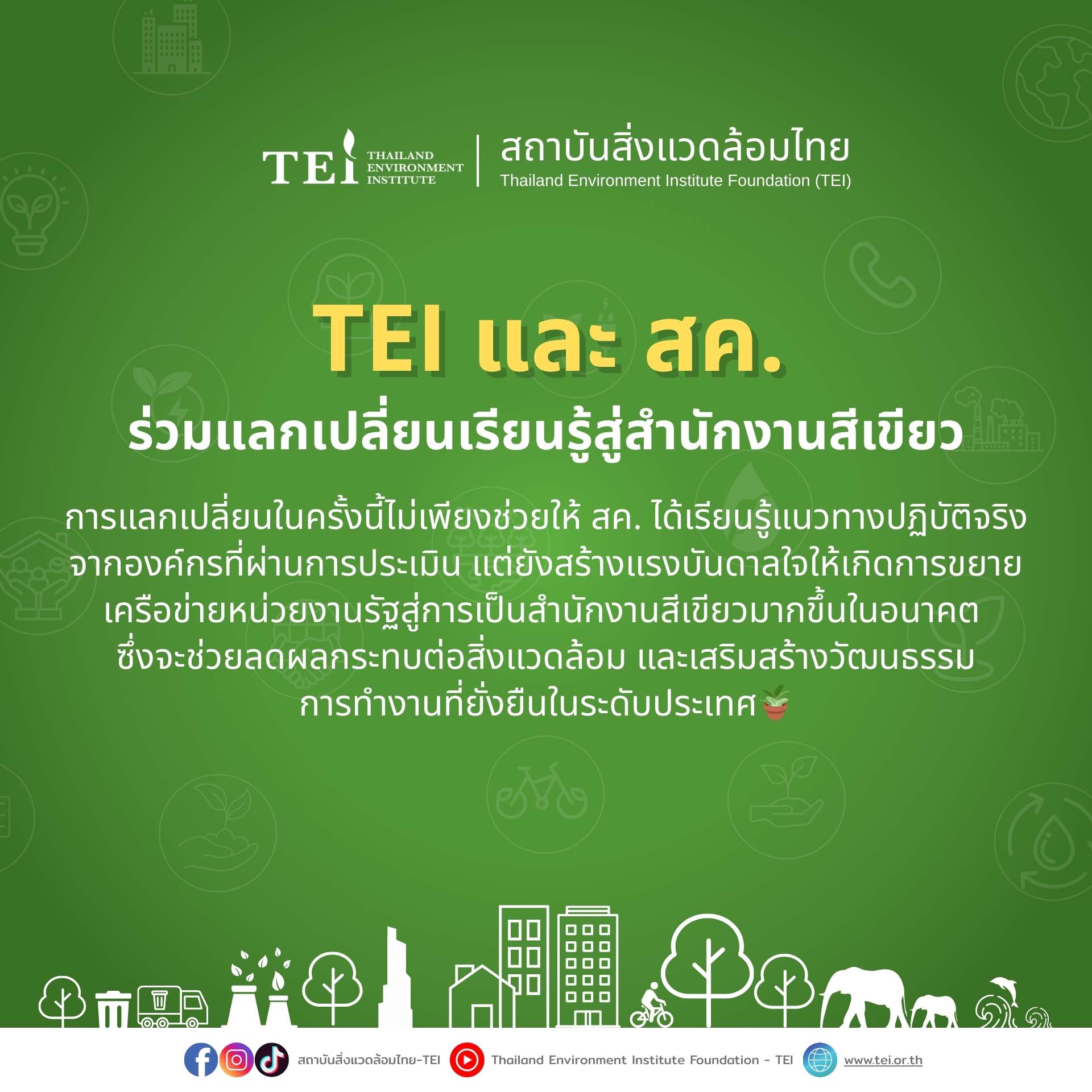 การศึกษาดูงานครั้งนี้เกิดขึ้นจากการที่ สค. เล็งเห็นบทบาทของ TEI ในฐานะองค์กรต้นแบบที่ได้รับรางวัลสำนักงานสีเขียวระดับ G ทอง 2 ครั้ง โดยกิจกรรมการแลกเปลี่ยนและการทำ Workshop ชี้ให้เห็นว่า การก้าวสู่สำนักงานสีเขียวนั้นต้องเริ่มต้นจากการสร้างความตระหนักรู้ด้านสิ่งแวดล้อมแก่บุคลากร ควบคู่กับการปรับเปลี่ยนพฤติกรรมการทำงานอย่างต่อเนื่อง ทั้งด้านการลดการใช้พลังงาน การจัดการขยะ การใช้ทรัพยากรอย่างคุ้มค่า และการสร้างวัฒนธรรมองค์กรที่สอดคล้องกับการพัฒนาอย่างยั่งยืน