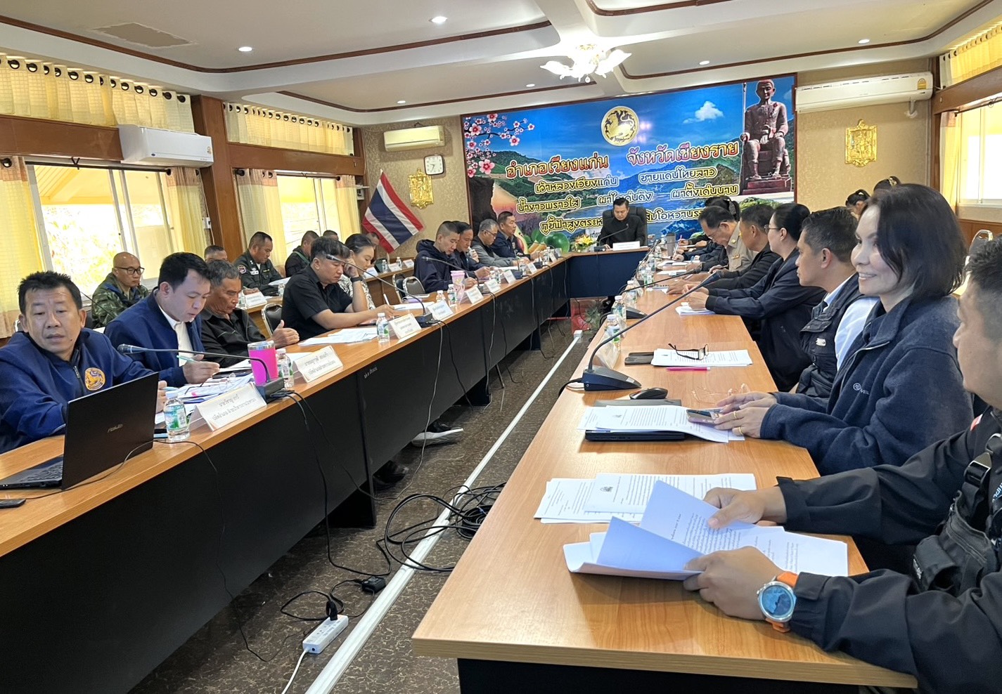 นางสาววิลาวรรณ น้อยภา หัวหน้าโครงการฯ และคุณศุภาพิชญ์ สงคำ ผู้ประสานงานโครงการ สถาบันสิ่งแวดล้อมไทย เข้าร่วมการหารือและการสนับสนุนความร่วมมือจากองค์การบริหารส่วนจังหวัดเชียงราย หัวหน้าส่วนงานราชการระดับอำเภอ และคณะกรรมการบริหารงานอำเภอแบบบูรณาการ( ก.บ.อ.เวียงแก่น) เพื่อบูรณาการและผลักดันให้เกิดรูปธรรมภายใต้งาน “วิ่ง 4 ภู ดูดาว 2 แผ่นดิน แนวกันไฟสัมพันธ์ไทย-ลาว” ซึ่งกำหนดจัดขึ้นในวันที่ 21-22 กุมภาพันธ์ที่จะถึงนี้ โดยมีความสอดคล้องนโยบายของจังหวัดเชียงรายกับแผนปฏิบัติการเชียงรายฟ้าใสในการลดมลพิษฝุ่นควันPM2.5 กระตุ้นการท่องเที่ยวธรรมชาติ ด้วยงานวิ่ง 4 ภู ดูดาว 2 แผ่นดิน (ภูผาหม่น-ภูชี้เดือน-ภูชี้ดาว-ภูชี้ฟ้า) ชุมชนพื้นที่สูง และ กิจกรรม Kick off ความร่วมมือ 4 อำเภอแนวกันไฟ 2 แผ่นดิน สัมพันธ์ไทย-ลาว การเพิ่มจุดลาดตระเวนและตรวจการของชุมชนบริเวณพื้นที่รอยต่อที่มีความเสี่ยงสูงและการสำรวจ เส้นทางลาดตระเวนในพื้นที่เสี่ยงเผาไหม้สูง ร่วมถึงการเสนอทำประกันภัยเพื่อเป็นสวัสดิการอาสาสู้ไฟป่าในพื้นที่เสี่ยงสูง และการจัดอบรมเพิ่มทักษะดับไฟให้กับผู้นำและพรานป่าในท้องที่/ชุมชน เพื่อเชื่อมหน่วยงานภาคีในการสนับสนุนและต่อยอด การบูรณาการยกระดับความร่วมมือในพื้นที่จังหวัดเชียงราย ตลอดจนเสริมสร้างความร่วมมือระหว่างประเทศเพื่อนบ้านและเชื่อมโยงสร้างความร่วมมือเมืองคู่ขนานร่วมกับประเทศเพื่อนบ้านต่อไป