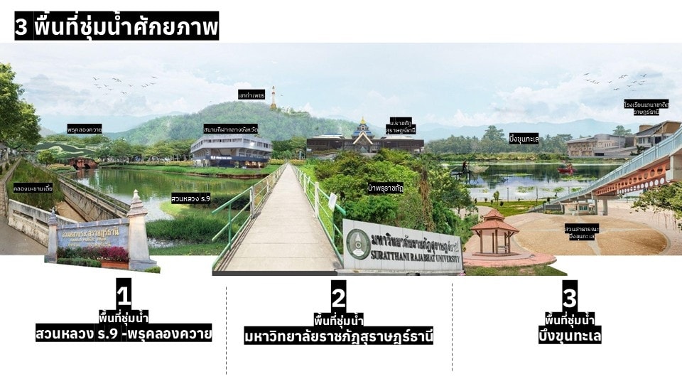 - หย่อมป่าพรุ มหาวิทยาลัยราชภัฏสุราษฎร์ธานี - ปรับสิ่งกีดขวางทางน้ำ เพิ่มจุดรับ–ระบายน้ำ พัฒนาคลองไส้ไก่ ฟื้นฟูระบบพรุ และเชื่อมกับแนวคิด Green Campus เพื่อคืนบทบาทพรุเป็นแหล่งกักเก็บน้ำและพื้นที่เรียนรู้เชิงนิเวศ