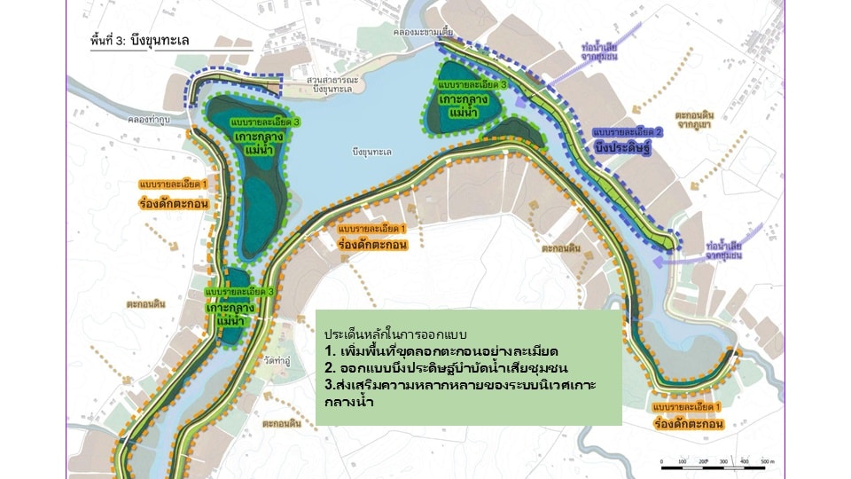- บึงขุนทะเล - ขุดลอกตะกอนเชิงนิเวศ ออกแบบบึงประดิษฐ์ (Constructed Wetland) บำบัดน้ำเสีย ฟื้นฟูระบบนิเวศเกาะกลางน้ำ เพื่อพัฒนาแหล่งน้ำให้ทำหน้าที่รับน้ำ บำบัดน้ำ และนันทนาการควบคู่กัน