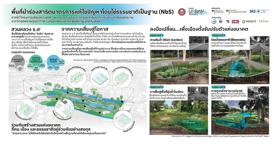 - สวนหลวง ร.9 - เพิ่มพื้นที่รับและกระจายน้ำ ขยายพื้นที่ชุ่มน้ำย่อย ปรับโครงสร้างบางส่วนให้เอื้อต่อการไหลของน้ำ และใช้ระบบบำบัดน้ำเสียแบบธรรมชาติ เพื่อลดภาระระบบท่อและยกระดับภูมิทัศน์เมือง