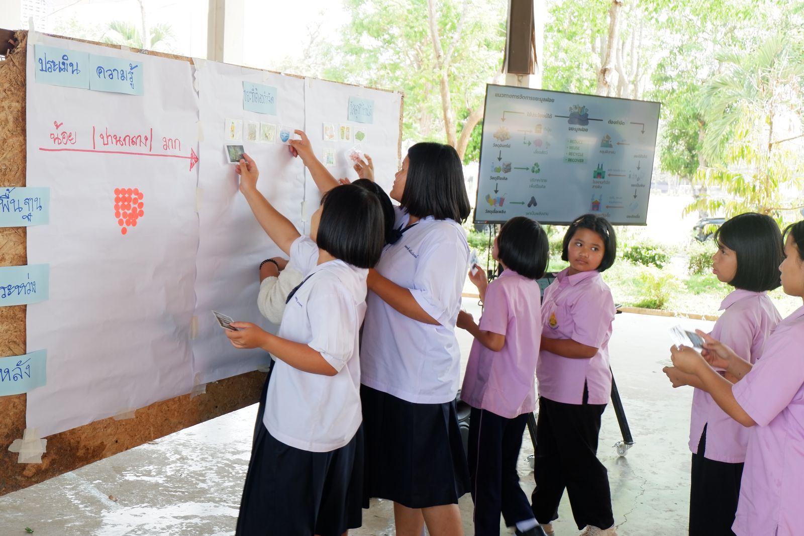 ผลการสำรวจองค์ประกอบมูลฝอยของทั้งสองโรงเรียนพบว่า วัสดุส่วนใหญ่ยังสามารถนำกลับมาใช้ประโยชน์ได้ โดยประกอบด้วย วัสดุรีไซเคิล 45% พลาสติกเชื้อเพลิง 18% วัสดุอินทรีย์ (ส่วนใหญ่เป็นใบไม้ ตะเกียบไม้) 14% ขณะที่ขยะที่ต้องกำจัดมีสัดส่วนรวม 23% ได้แก่ ขยะใช้ไม่ได้ 18% ขยะเป็นพิษ 5%