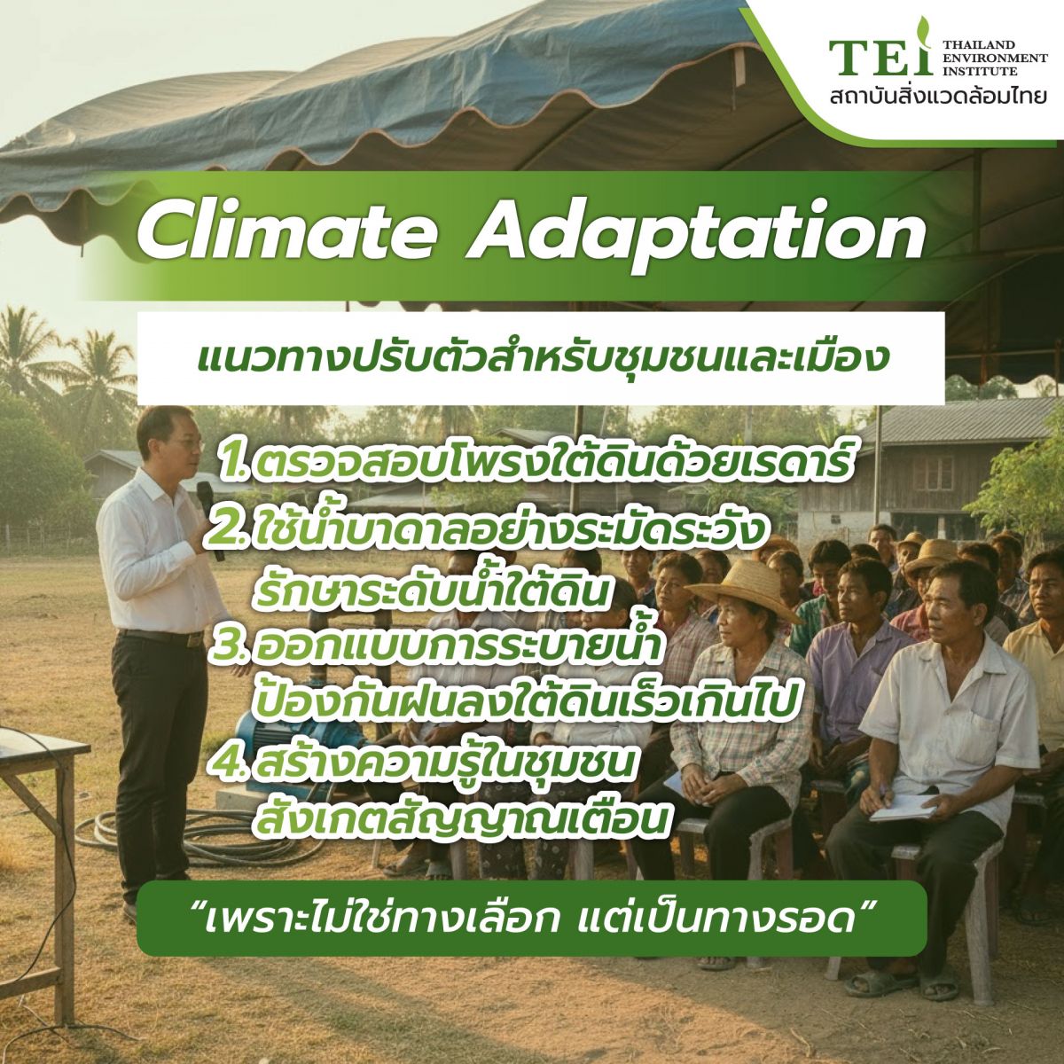 The Thailand Environment Institute (TEI) perceives that the uncertainty of global boiling, combined with pre-existing drought conditions, has led to a reliance on groundwater pumping. This method of combating drought has become a ‘chronic problem’ that increases the likelihood of sinkholes. At the same time, unseasonably heavy rainfall is another factor that adds weight and erodes the subsoil, making sinkholes more severe than ever. Our only path forward is “Climate Adaptation.” While we may not be able to control the balance of a changing world, we can ‘adapt to live, know to survive’ to prevent the danger of sinkholes caused by global boiling. This adaptation is not just an “option” but a critical “path to survival” essential for human existence.