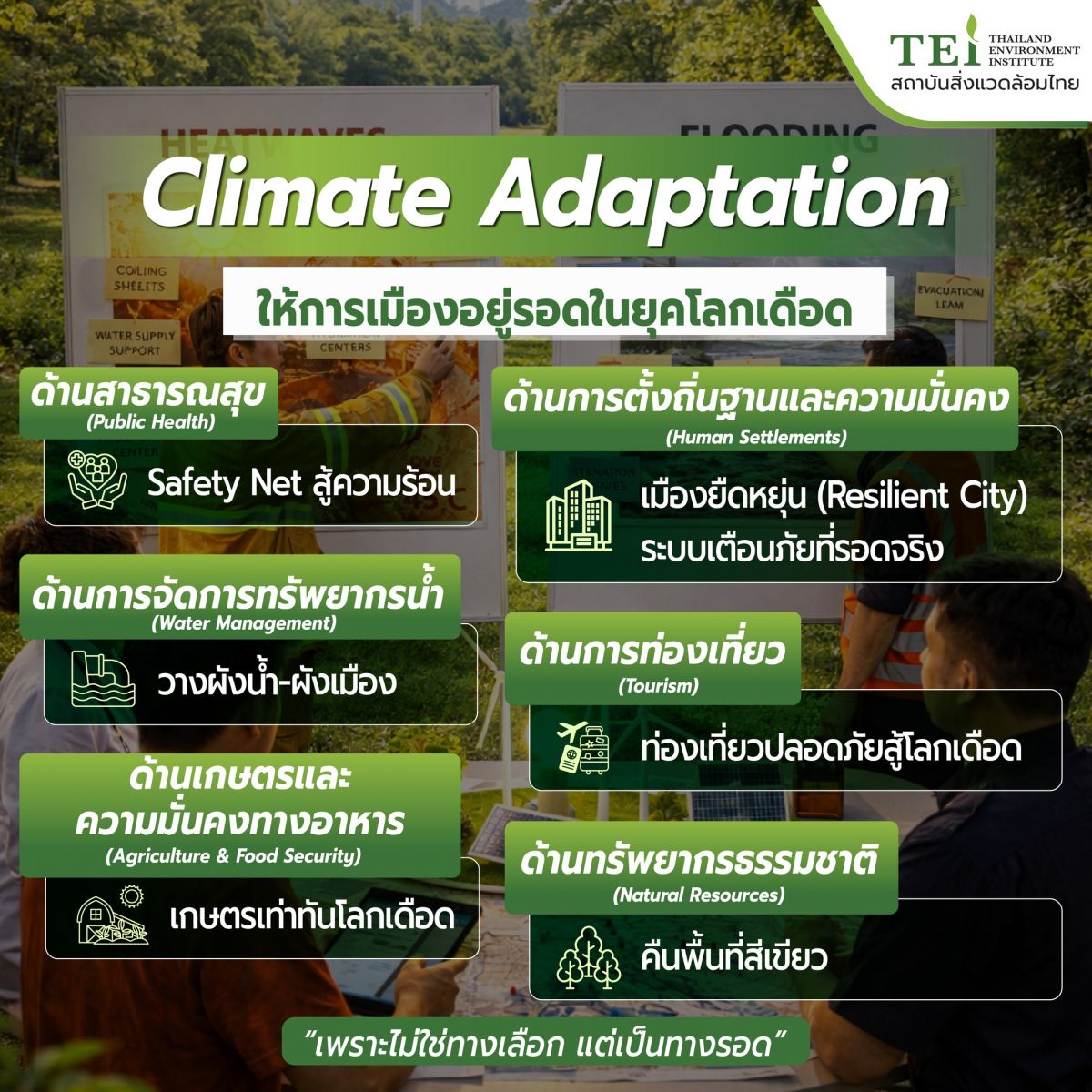 The Thailand Environment Institute (TEI) prioritizes communicating Climate Adaptation for the public good. Following the "Adapt to Live, Learn to Survive" approach, which aligns with the National Adaptation Plan (NAP), government agencies should adapt and implement the following environmental policies: