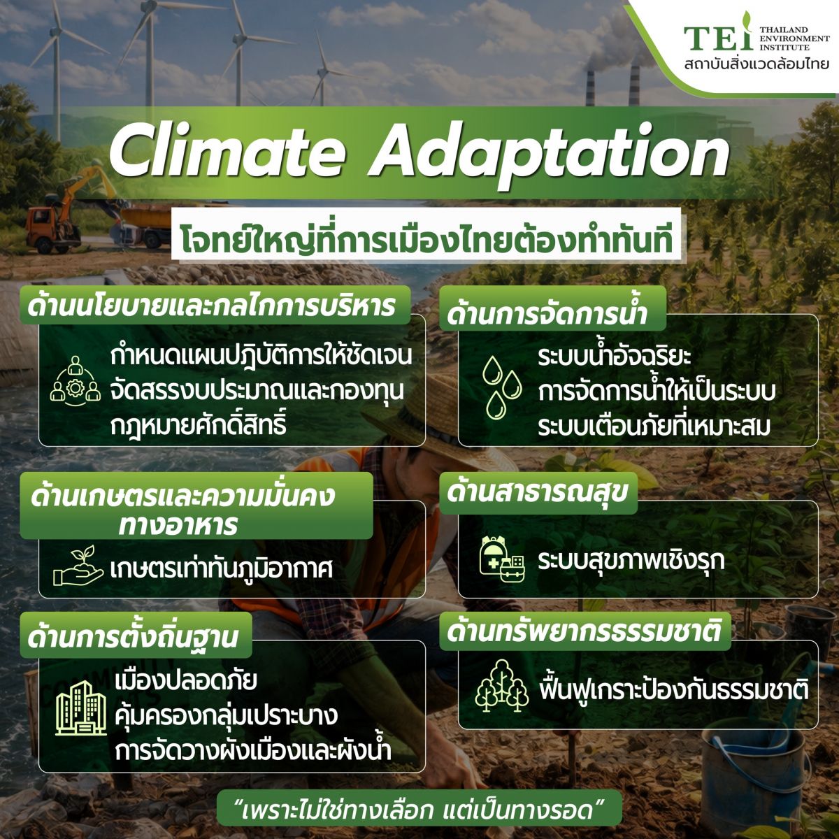 This is the grand challenge Thai politics must address immediately. The Thailand Environment Institute (TEI), speaking for the people, proposes the Climate Adaptation framework. This is a call to elevate climate resilience to the policy level, aligning with the National Adaptation Plan (NAP) to turn "promises" into concrete actions for the survival of both the political sector and the public.