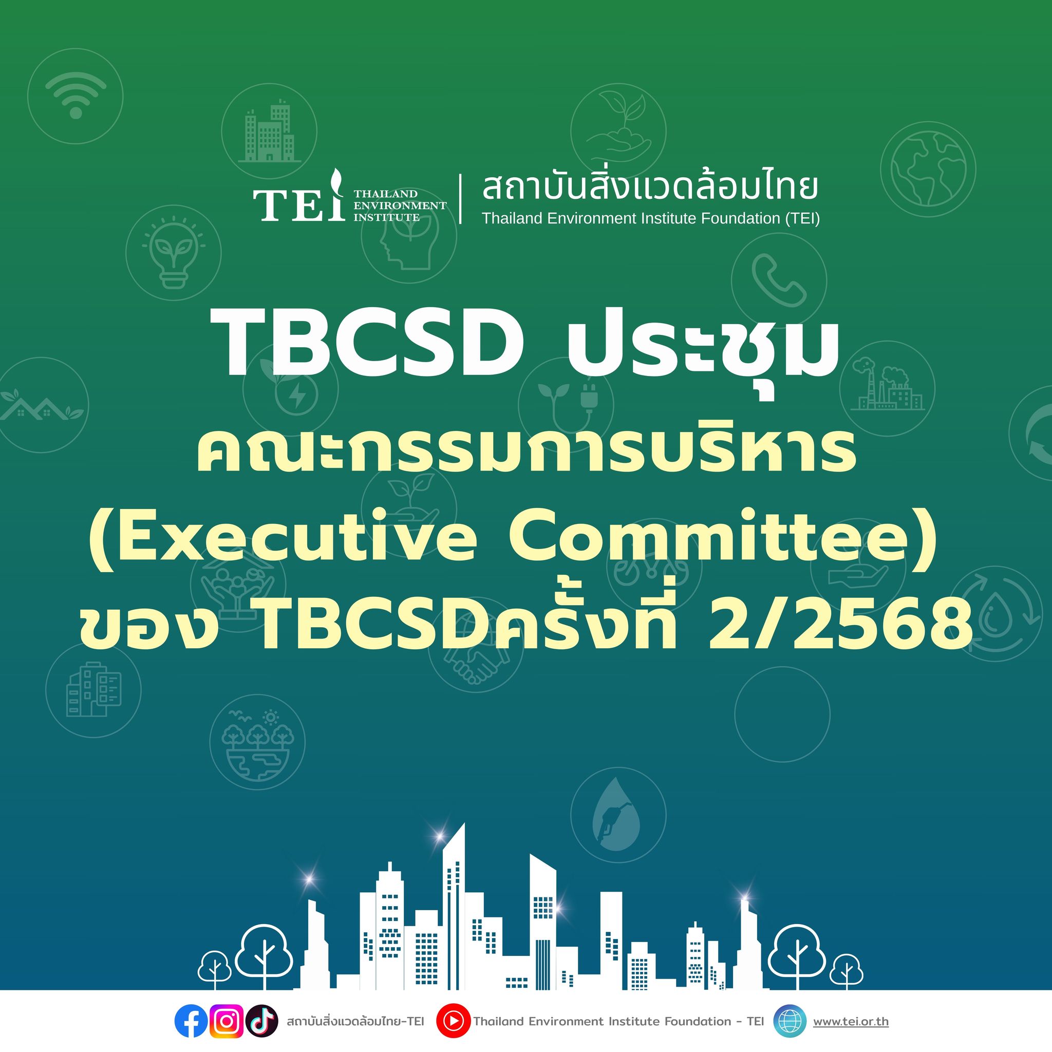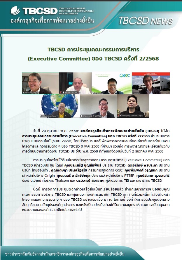 20 ตุลาคม พ.ศ. 2568: องค์กรธุรกิจเพื่อการพัฒนาอย่างยั่งยืน (TBCSD) ได้จัดการประชุมคณะกรรมการบริหาร (Executive Committee) ของ TBCSD ครั้งที่ 2/2568 ผ่านระบบแบบออนไลน์ (ระบบ Zoom) โดยมีวัตถุประสงค์เพื่อพิจารณารายละเอียดเกี่ยวกับการดำเนินงานโครงการและกิจกรรมต่าง ๆ ของ TBCSD ปี พ.ศ. 2568 ที่ผ่านมา รวมถึง การพิจารณารายละเอียดเกี่ยวกับการดำเนินงานการจัดงาน TBCSD ประจำปี พ.ศ. 2568 ที่กำหนดจัดงานในวันที่ 2 ธันวาคม พ.ศ. 2568