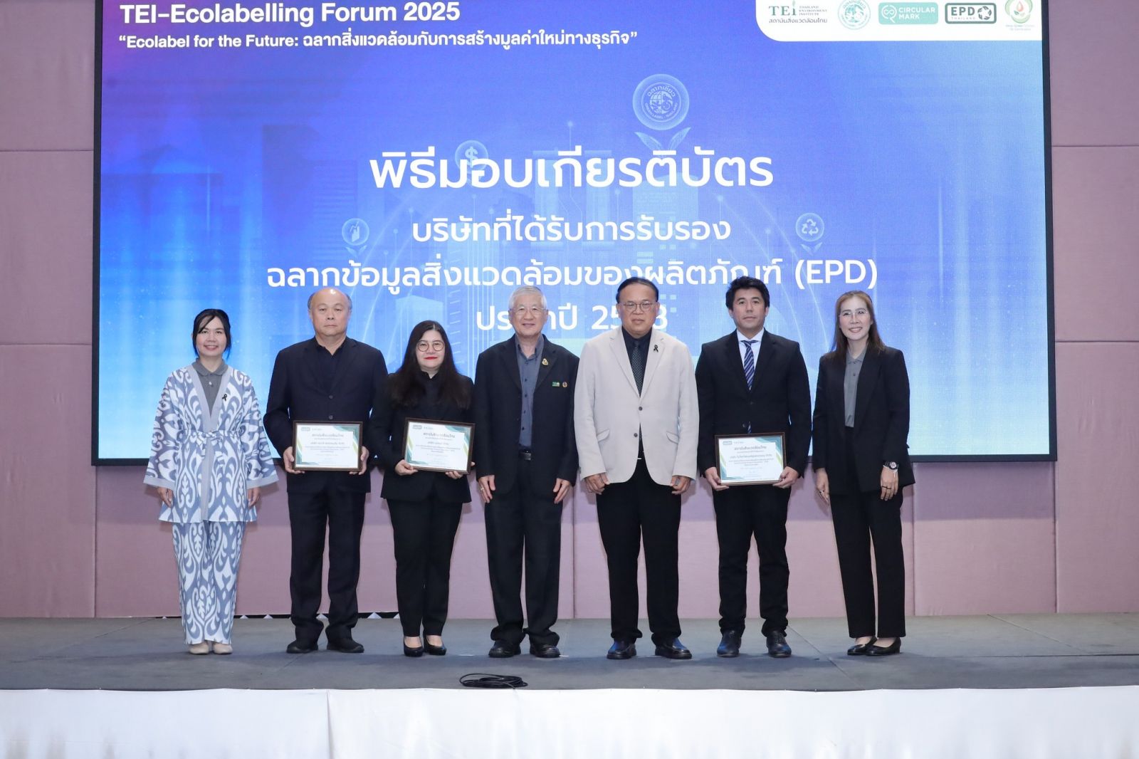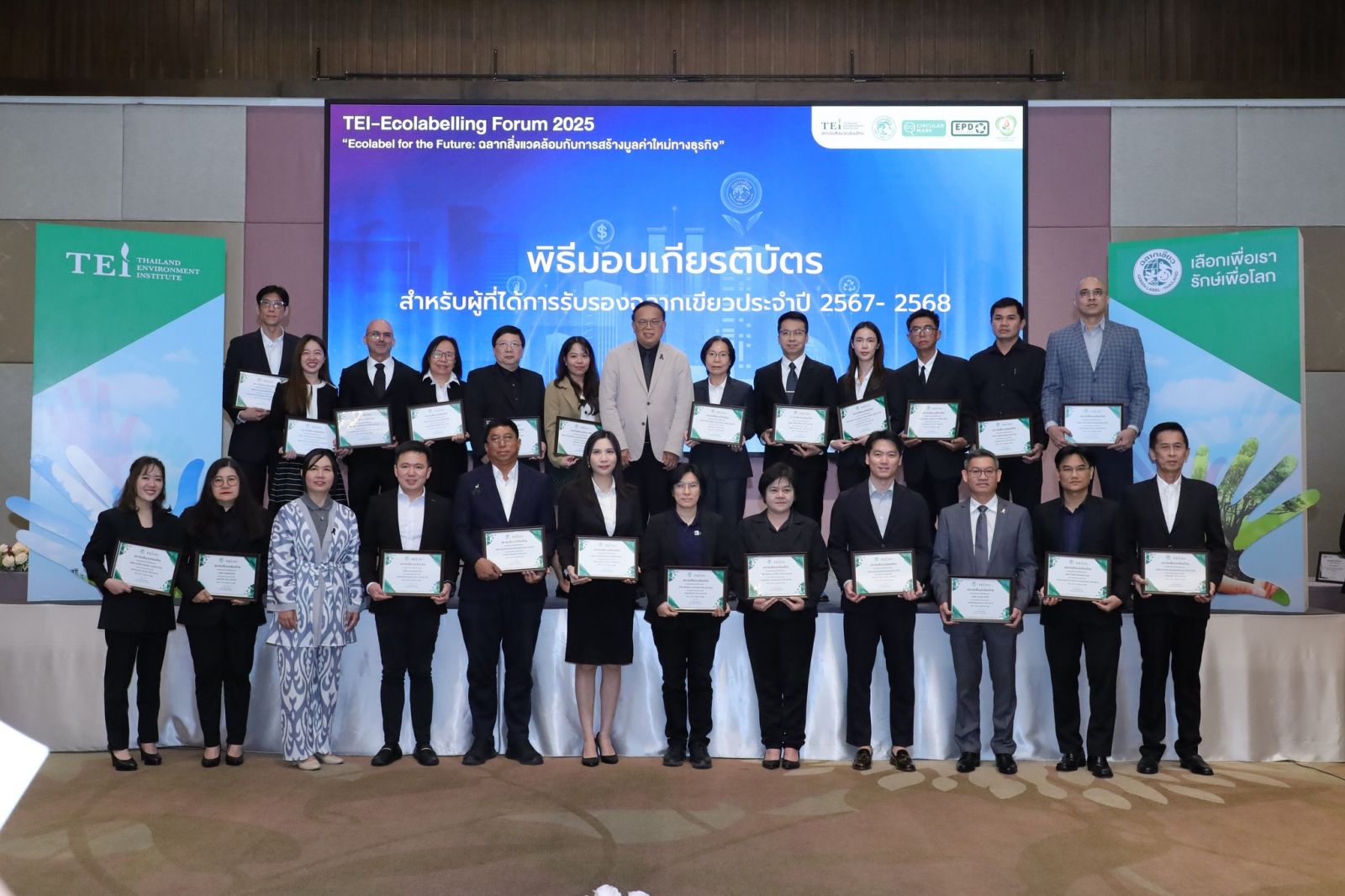 สำหรับกิจกรรมภายในงาน ยังได้เปิดเวทีเสวนาในหัวข้อ “ทิศทางฉลากสิ่งแวดล้อมของโลก โอกาสทางธุรกิจใหม่ และการจัดซื้อสีเขียว” ซึ่งมีผู้ทรงคุณวุฒิจากภาคส่วนต่างๆ ทั้งภาควิชาการ โดย รศ.ดร. ธำรงรัตน์ มุ่งเจริญ ประธานมูลนิธิเพื่อส่งเสริมการผลิตและการบริโภคอย่างยั่งยืนแห่งเอเซียแปซิฟิกกรรมการบริหารสถาบันสิ่งแวดล้อมไทย ภาคธุรกิจค้าปลีก โดยคุณณพล ก่อก้องวิศรุต VP Ecosystem บริษัท โฮม โปรดักส์ เซ็นเตอร์ จำกัด (มหาชน) และภาคอุตสาหกรรมก่อสร้าง ผู้เชี่ยวชาญด้านอาคารเขียว และที่ปรึกษาโครงการ Green Building Market Transformation Consultant Thailand, International Finance Corporation มาร่วมแลกเปลี่ยนมุมมอง พร้อมพิธีมอบเกียรติบัตร เพื่อเชิดชูเกียรติแก่ผู้ประกอบการที่มุ่งมั่นดำเนินงานจนได้รับการรับรองมาตรฐานฉลากสิ่งแวดล้อม ได้แก่ ฉลากเขียว ฉลากผลิตภัณฑ์หมุนเวียน (Circular Mark) ฉลากข้อมูลสิ่งแวดล้อมของผลิตภัณฑ์ (EPD) และ Inno-Green Station ประจำปี 2567-2568 รวมทั้งสิ้น 70 บริษัท