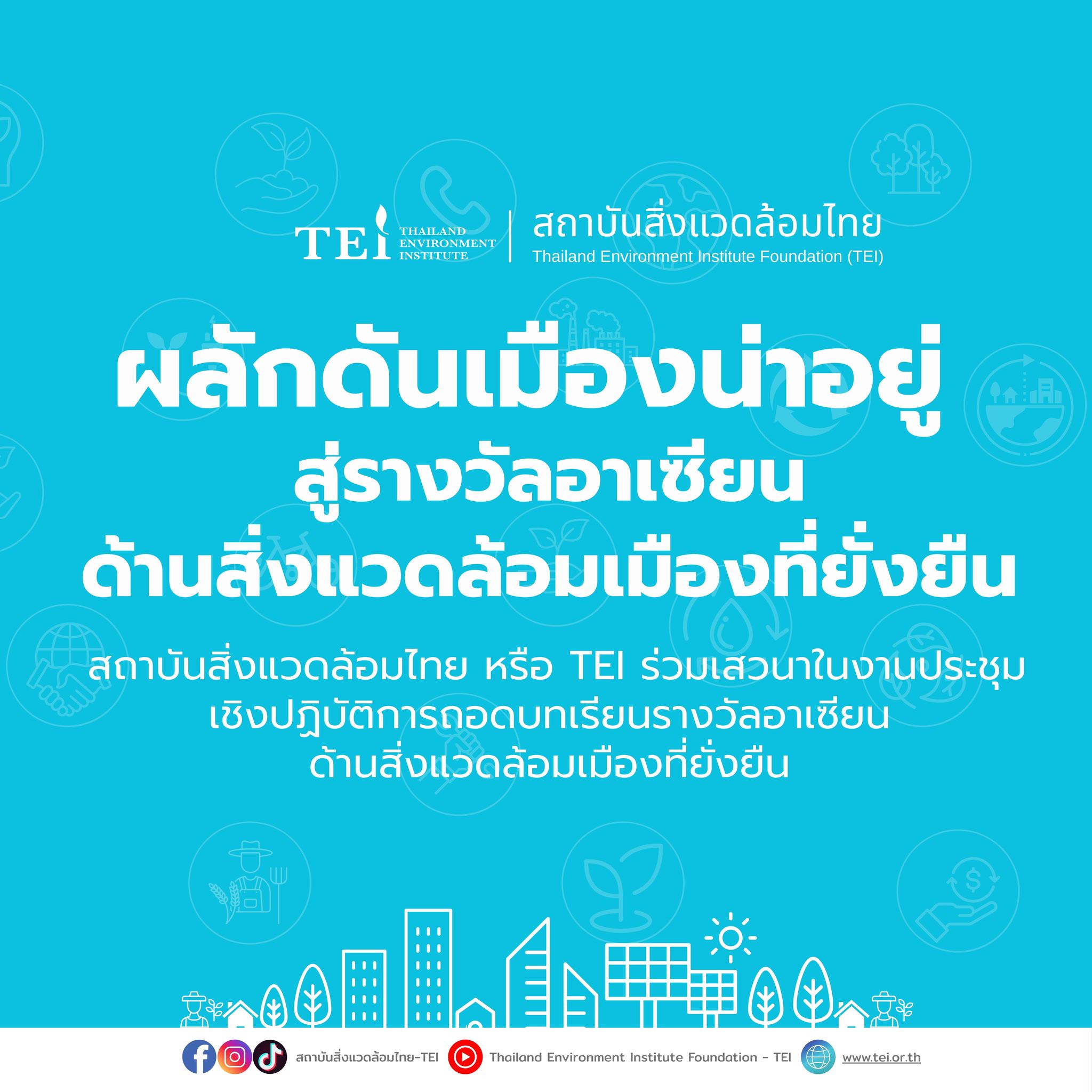 สถาบันสิ่งแวดล้อมไทย หรือ TEI โดย ดร.เบญจมาส โชติทอง ร่วมเสวนาในงานประชุมเชิงปฏิบัติการถอดบทเรียนรางวัลอาเซียนด้านสิ่งแวดล้อมเมืองที่ยั่งยืน จัดโดยกรมการเปลี่ยนแปลงสภาพภูมิอากาศและสิ่งแวดล้อม ระหว่างวันที่ 27-28 สิงหาคม 2568 ที่ผ่านมา