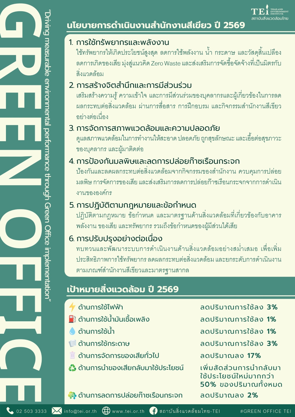 เพื่อรักษามาตรฐานการเป็นหน่วยงานชั้นนำด้านสิ่งแวดล้อมที่ไม่ใช่แค่การทำโครงการ แต่ยังคำนึงถึงสิ่งแวดล้อมในการปฏิบัติงานในสำนักงาน สถาบันสิ่งแวดล้อมไทยจึงได้ประกาศนโยบายด้านการดำเนินงานสำนักงานสีเขียว โดยในปี 2569 ได้มีการทบทวนใหม่ให้ทันสมัย และพร้อมรับใช้สังคมอยู่เสมอ
