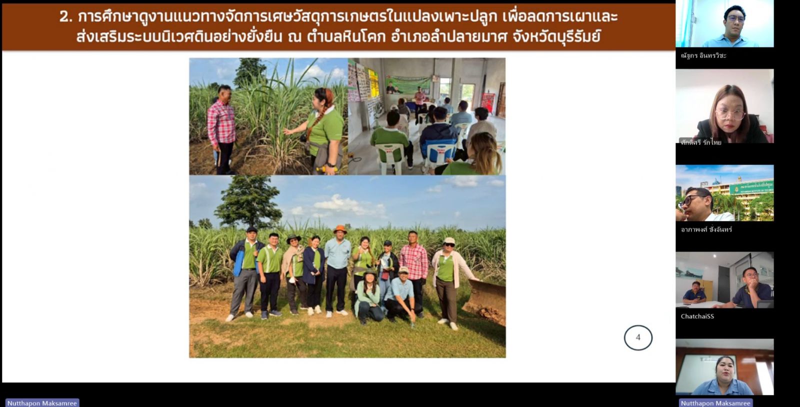 26 กันยายน 2568 คณะนักวิจัยจากสถาบันสิ่งแวดล้อมไทย และสถาบันเทคโนโลยีปทุมวัน โดยได้รับการสนับสนุนทุนอุดหนุนการวิจัยและนวัตกรรมจาก สำนักงานการวิจัยแห่งชาติ (วช.) ได้จัดการประชุมศึกษาและแลกเปลี่ยนเรียนรู้ ภายใต้โครงการ “พัฒนาและขยายเครือข่ายเกษตรกรสู่การจัดการวัสดุเหลือใช้ทางการเกษตรอย่างยั่งยืน กรณีศึกษาการจัดการใบอ้อยในจังหวัดลพบุรี” ในการประชุมครั้งนี้จัดขึ้นในรูปแบบออนไลน์ โดยได้รับความอนุเคราะห์จาก โรงงานน้ำตาลกลุ่มบริษัทไทยรุ่งเรือง (โรงงานน้ำตาลสระบุรี) ซึ่งมีบทบาทสำคัญในฐานะผู้ผลิตอ้อยและน้ำตาลรายใหญ่ของประเทศ และเป็นองค์กรที่มีแนวปฏิบัติด้านการจัดการวัตถุดิบและสร้างสัมพันธ์กับเครือข่ายเกษตรกร