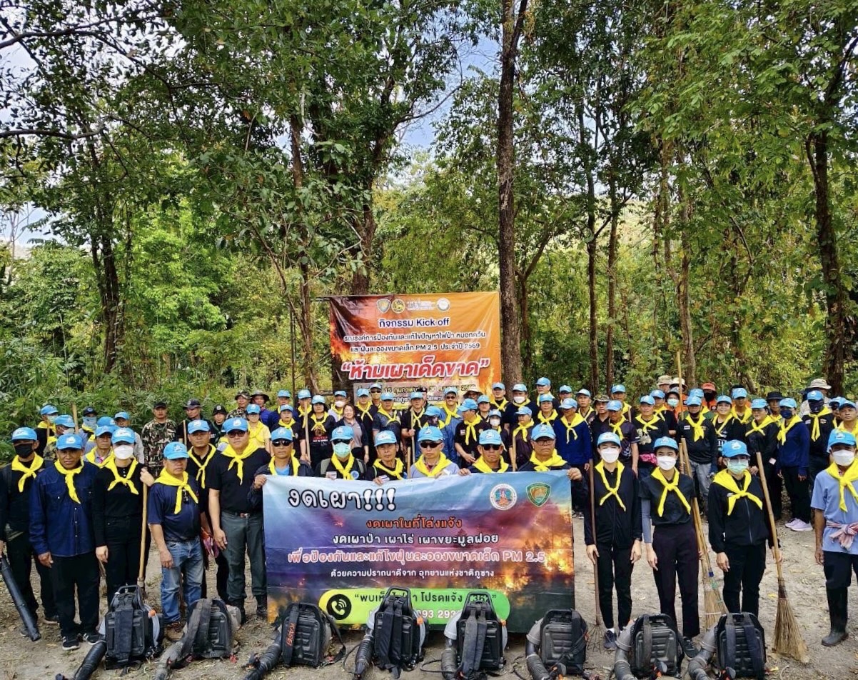 2 กุมภาพันธ์ 2569 สถาบันสิ่งแวดล้อมไทย หรือ TEI ภายใต้การดำเนินงานโครงการพัฒนาความร่วมมือเมืองคู่ขนาน ไทย–ลาว–เมียนมา เพื่อขับเคลื่อนการจัดการและลดมลพิษหมอกควันข้ามแดน ด้วยการสนับสนุนโดยสำนักงานพัฒนาการวิจัยการเกษตร (องค์การมหาชน) ร่วมกับอำเภอภูซาง จังหวัดพะเยา หน่วยงานภาครัฐ องค์กรปกครองส่วนท้องถิ่น อุทยานแห่งชาติภูชางผู้นำชุมชน อาสาสมัครสาธารณสุขประจำหมู่บ้าน (อสม.) และประชาชนจิตอาสา จัดกิจกรรม Kick off ทำแนวกันไฟ ในพื้นที่ 7 หมู่บ้านตลอดแนวเขตชายแดน ได้แก่ บ้านทุ่งแขม บ้านดอนตัน บ้านร้อง บ้านยอดดอย บ้านเวียงแก่ บ้านทุ่งกว๋าว และบ้านปงใหม่ มีผู้เข้าร่วมกิจกรรม จำนวน 200 คน และร่วมการรณรงค์ป้องกันและแก้ไขปัญหาไฟป่า หมอกควัน และฝุ่นละอองขนาดเล็ก PM2.5 ประจำปี 2569