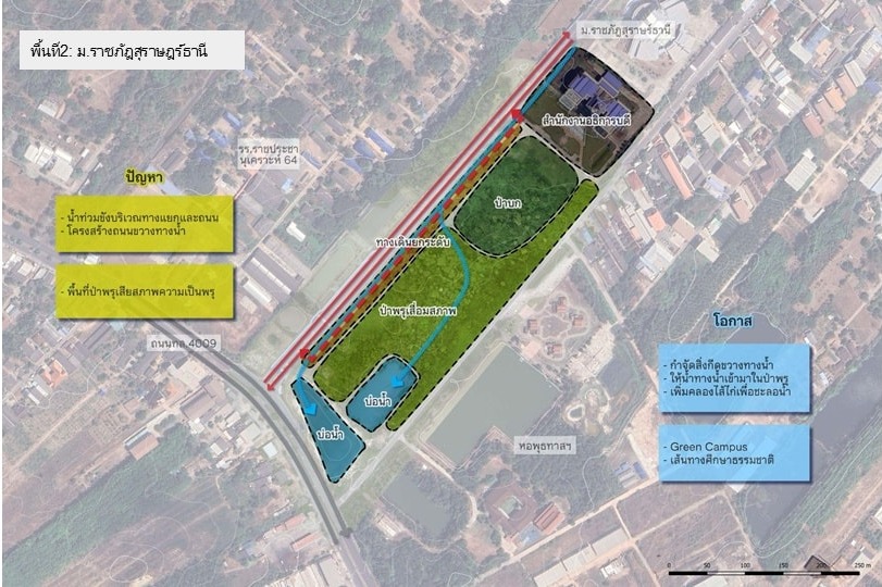 - หย่อมป่าพรุ มหาวิทยาลัยราชภัฏสุราษฎร์ธานี - ปรับสิ่งกีดขวางทางน้ำ เพิ่มจุดรับ–ระบายน้ำ พัฒนาคลองไส้ไก่ ฟื้นฟูระบบพรุ และเชื่อมกับแนวคิด Green Campus เพื่อคืนบทบาทพรุเป็นแหล่งกักเก็บน้ำและพื้นที่เรียนรู้เชิงนิเวศ