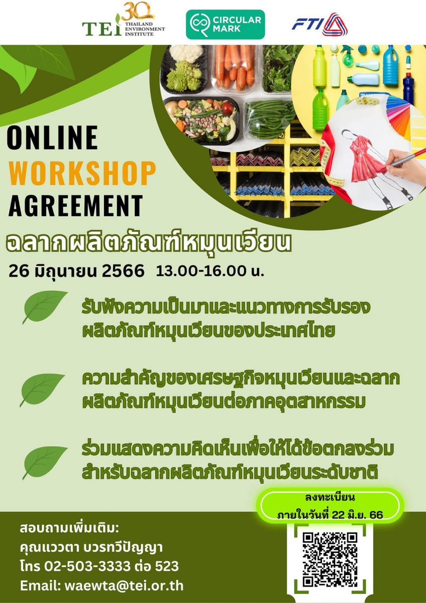 “สถาบันสิ่งแวดล้อมไทย ได้กำหนดจัดการประชุมเชิงปฏิบัติการเพื่อรับฟังความคิดเห็นและจัดทำข้อตกลงร่วมกันของผู้มีส่วนได้ส่วนเสียต่อ “ข้อกำหนดฉลากผลิตภัณฑ์หมุนเวียน (Circular Mark)” ให้มีความเหมาะสม ตอบสนองต่อการขับเคลื่อนและผลักดันนโยบายเศรษฐกิจหมุนเวียนของประเทศ เป็นการเพิ่มประสิทธิภาพการใช้ทรัพยากร รักษาฐานทรัพยากรของประเทศ ลดปริมาณของเสีย และลดผลกระทบต่อสิ่งแวดล้อมทุกด้าน รวมทั้งการขับเคลื่อนวาระแห่งชาติ โมเดลเศรษฐกิจ BCG เพื่อให้การดำเนินงานบรรลุวัตถุประสงค์การจัดทำข้อตกลงร่วมในการประชุมเชิงปฏิบัติการนี้ จึงขอเรียนเชิญผู้ที่มีส่วนได้ส่วนเสียทุกท่านเข้าร่วมการประชุมดังกล่าว ในวันจันทร์ที่ 26 มิถุนายน 2566 เวลา 13.00 – 16.00 น. ผ่านระบบออนไลน์โปรแกรม ZOOM”