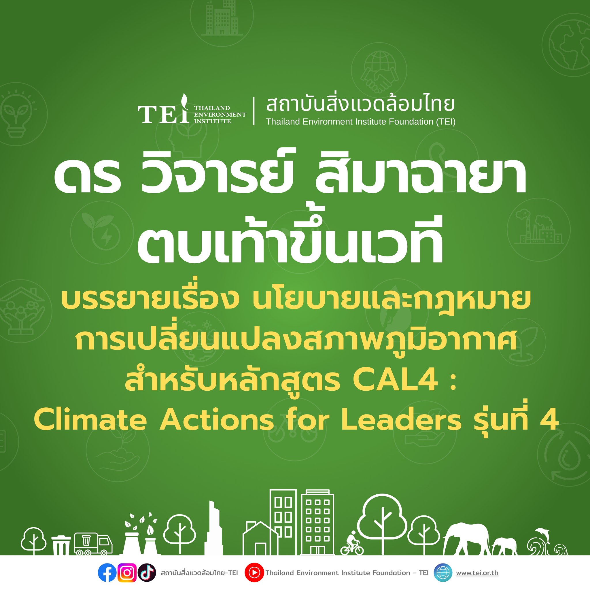 25 กันยายน 2568 ดร วิจารย์ สิมาฉายา เป็นวิทยากร บรรยายเรื่อง นโยบายและกฎหมายการเปลี่ยนแปลงสภาพภูมิอากาศ สำหรับหลักสูตร CAL4 : Climate Actions for Leaders รุ่นที่ 4 จัดโดย องค์การบริหารจัดการก๊าซเรือนกระจก (องค์การมหาชน) และกรมการเปลี่ยนแปลงสภาพภูมิอากาศและสิ่งแวดล้อม (สส.)