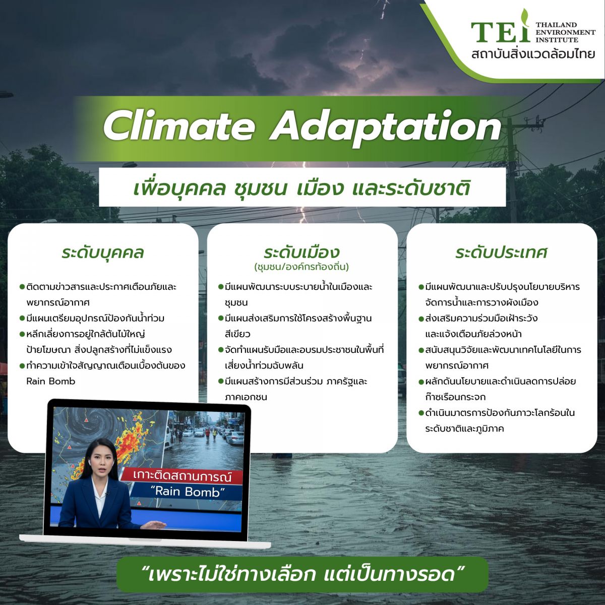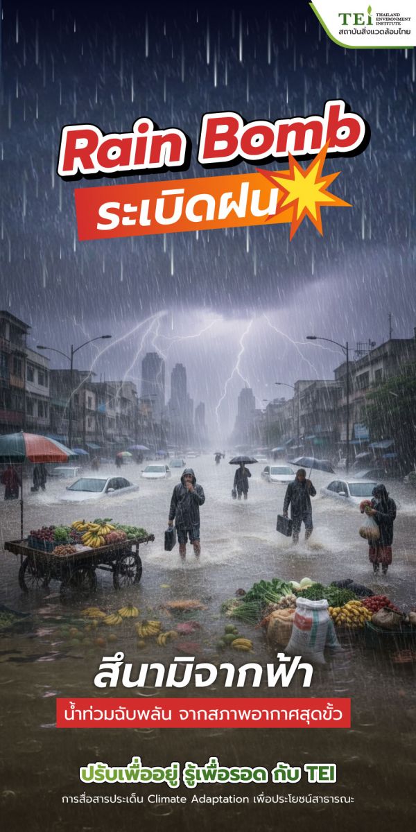 The Thailand Environment Institute (TEI) recognizes the "Rain Bomb" issue because it is a clear warning sign that "old rainfall patterns have ended." We all must understand the risks from the sky. Our only path to survival is ‘Climate Adaptation’ to live with the coming extreme weather volatility that may cause severe damage. TEI is therefore committed to prioritizing communication on Climate Adaptation for the public good.