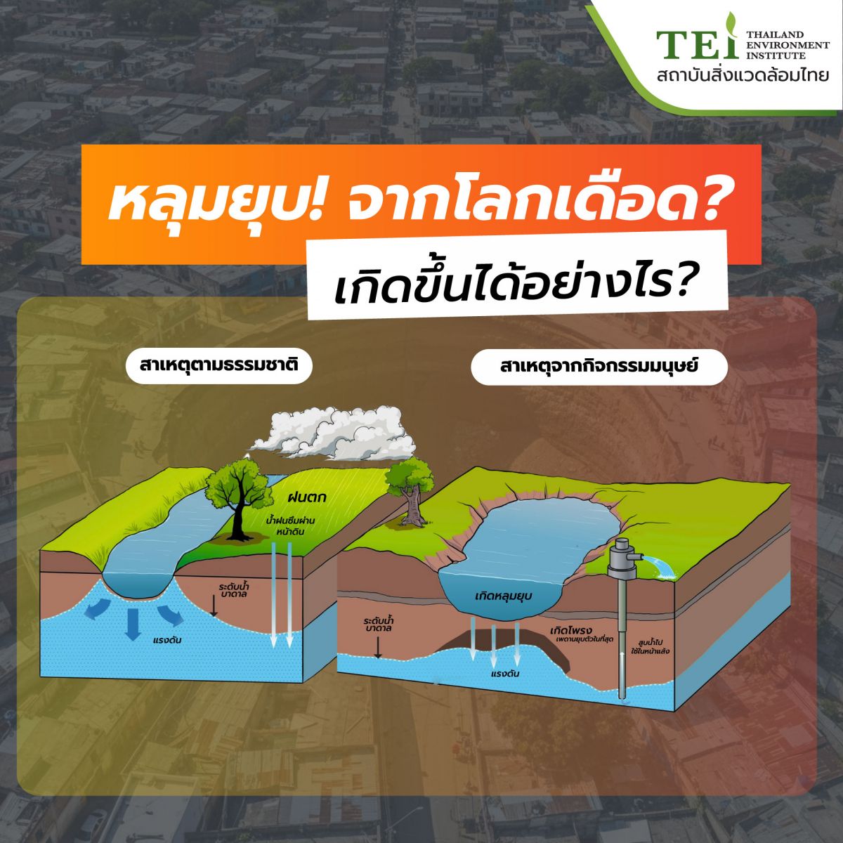 Climate Change หรือ ‘โลกเดือด’ กำลังเป็นภัยคุกคามใหม่ ที่ชี้ว่าการเปลี่ยนแปลงสภาพภูมิอากาศเป็น ‘ตัวกระตุ้น’ หลัก เพราะเมื่อฝนไม่ตกตามฤดูกาล บางช่วงบางปีเกิดฝนทิ้งช่วง ก่อภัยแล้ง บ่อยและหนักขึ้นอย่างผิดปกติ ทำให้คนในหลายพื้นที่ต้องรีบพึ่งพา การสูบน้ำบาดาล ขึ้นมาใช้เพื่ออุปโภคและการเพาะปลูก แต่การสูบน้ำบาดาลเพื่อแก้ปัญหาภัยแล้งของไทยในช่วงหลายสิบปีที่ผ่านมา ก่อให้เกิดผลกระทบอย่างเลี่ยงไม่ได้ นั่นคือ จุดกำเนิดของปัญหา ‘หลุมยุบ’ ที่มาจากการสูบน้ำบาดาลขึ้นมาใช้