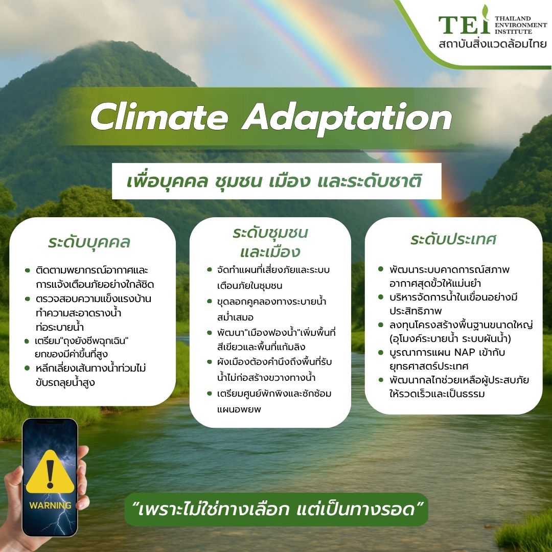 TEI ขอเป็นหน่วยงานที่ให้ความสำคัญในการสื่อสารประเด็น การปรับตัวต่อการเปลี่ยนแปลงสภาพภูมิอากาศ (Climate Adaptation) เพื่อประโยชน์ต่อสาธารณะ ให้คนไทยมีความพร้อม ตามแนวทาง ‘ปรับเพื่ออยู่ รู้เพื่อรอด’ ยกระดับคุณภาพชีวิตคนไทยให้ปลอดภัยต่อ Climate Change หรือ การเปลี่ยนแปลงสภาพภูมิอากาศ ตามแนวทางแต่ละระดับ ดังนี้